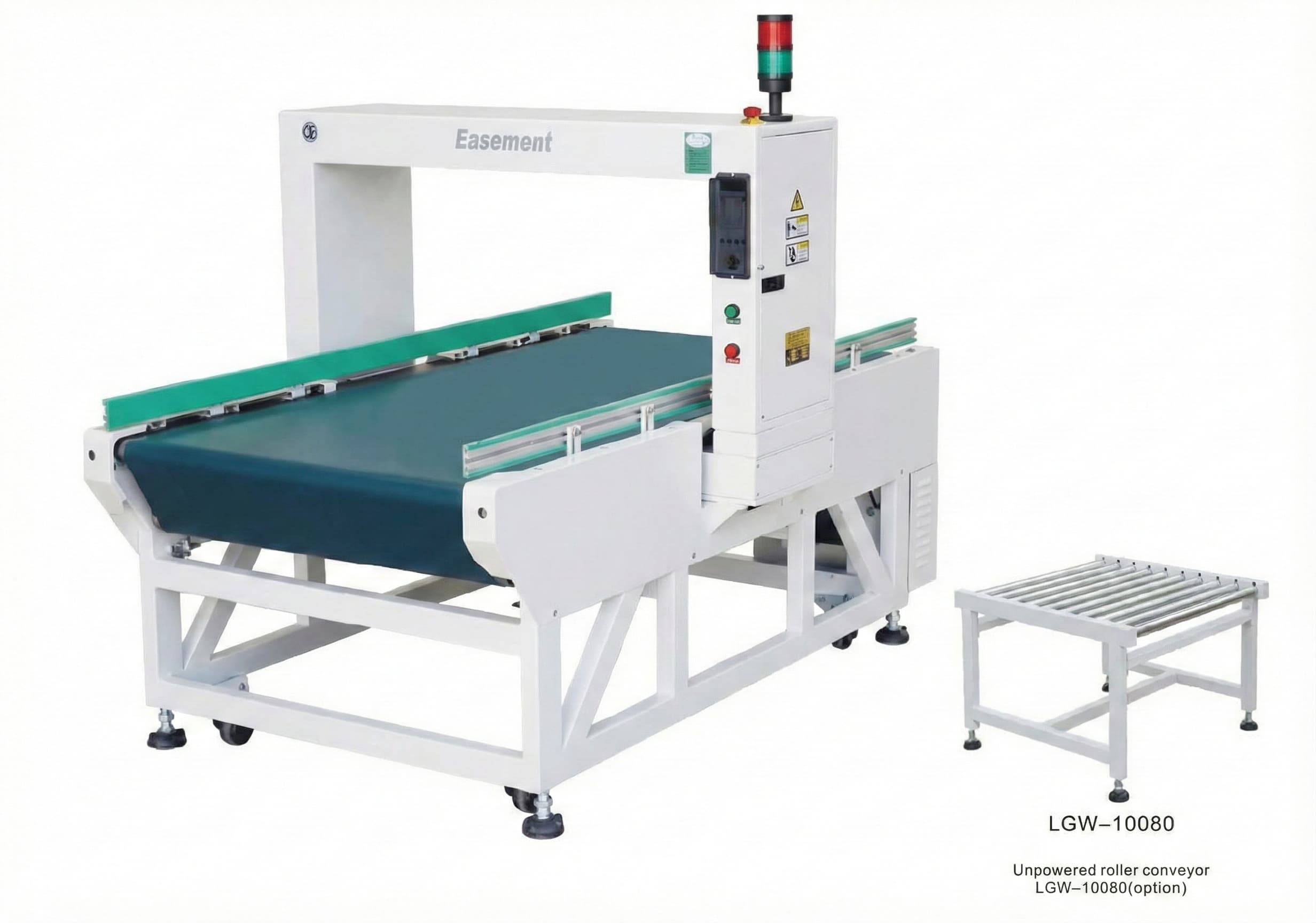 Buzzer + LED indicator + belt stop ensures no contaminated item passes through